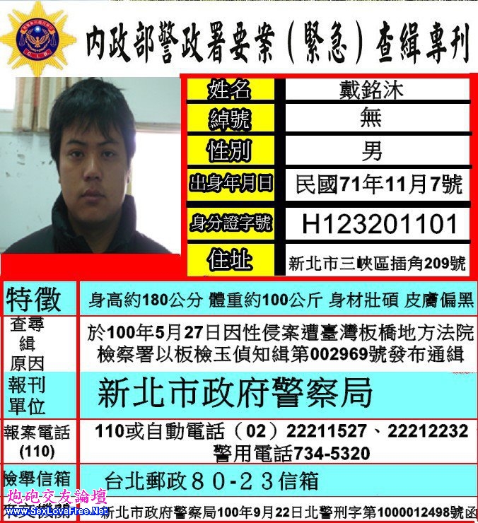 新北市女性民眾請小心!又有性侵惡狼行蹤不明,在外「趴趴走」!警政署昨(30)日再度針對戴銘沐、蔡水森及任金維等3名性侵假釋犯,發布要案查緝專刊。