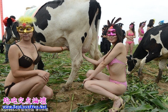 ▼2012年8月18日,山西省朔州市山陰縣,比基尼模特為優質乳牛當「牛模特」,與乳牛親密接觸。當天,山陰縣聯合美國奧蘭治華威縣舉辦首屆「奶牛選美大賽」,透過奶牛(乳牛)的產奶質量、外貌、家族血統選出首屆「奶牛小姐」冠軍。(圖/東方IC)