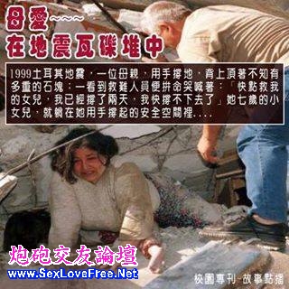 一位母親,用手撐地,背上頂著不知有多重的石塊;一看到救難人員便拼命哭喊著:「快點救我的女兒,我已經撐了兩天,我快撐不下去了」她七歲的小女兒,就躺在她用手撐起的安全空間裡。